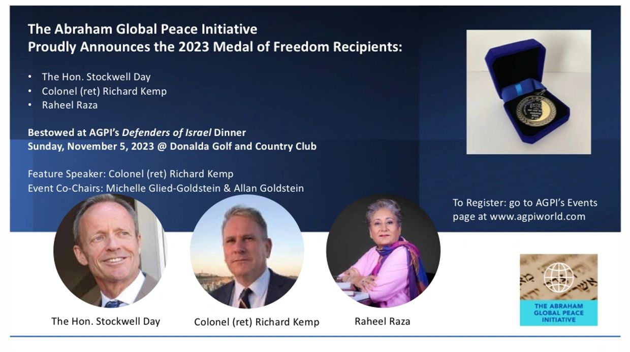The 2023 Medal of Freedom Recipients include Colonel (ret) Richard Kemp; Raheel Raza and The Hon. Stockwell Day.