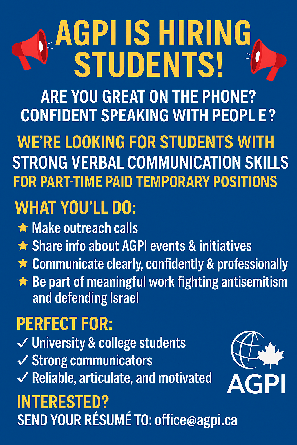 AGPI is hiring students for part-time, paid, temporary positions. We are looking for confident, articulate communicators who are great on the phone and comfortable speaking with people. Students will make outreach calls, share information about AGPI events and initiatives, and represent our mission professionally. This is meaningful work fighting antisemitism and defending Israel. Ideal for university and college students who are reliable, motivated, and strong verbal communicators. Interested candidates should send their résumé to office@agpi.ca.