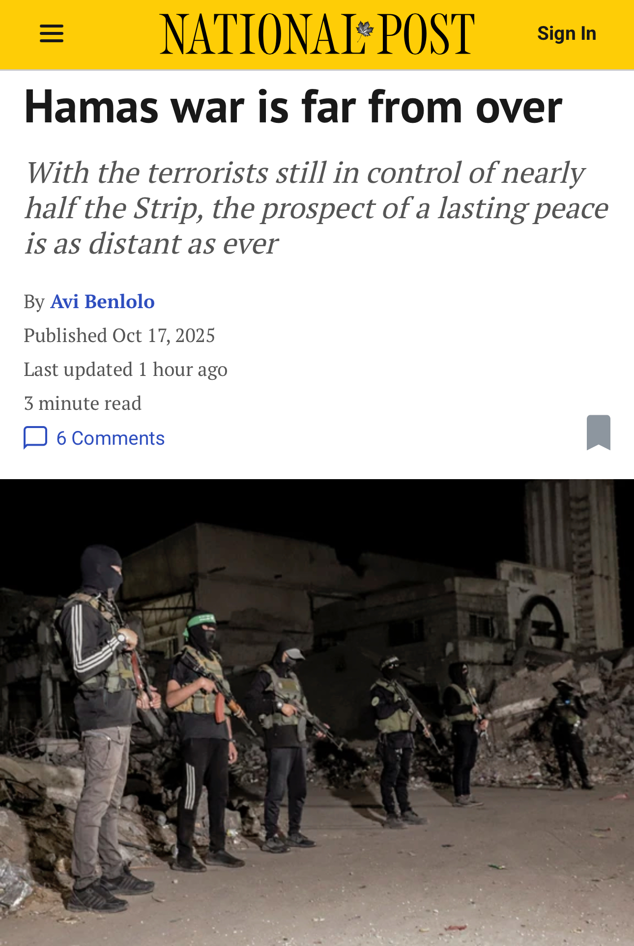 In today's National Post, AGPI explains why Hamas will not disarm. It will not dissolve or fade away. It will almost certainly try to use this opportunity to reconstitute, despite its severe battlefield losses. Throughout the week, Hamas has been systematically eliminating its rivals. In the coming days and weeks, it will likely seek to establish absolute dominance over the 47 per cent of Gaza that it now controls. Hamas will not surrender because it’s not in its nature. Its religious ideology and its founding charter clearly reject the State of Israel, and there is no credible alternative government that has either taken root internally or been forced upon it by the international community. Read article HERE
