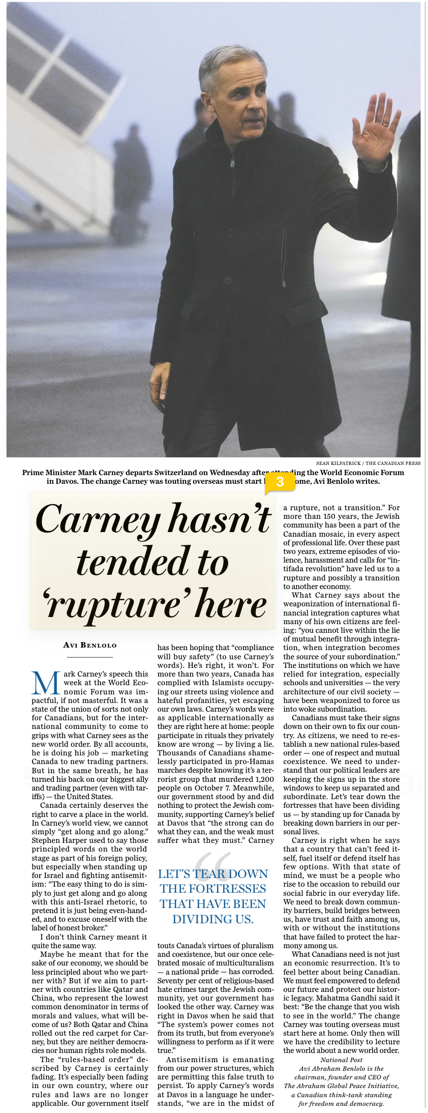 In today's National Post, we wrote: "What Canadians need is not just an economic resurrection. It’s to feel better about being Canadian. We must feel empowered to defend our future and protect our historic legacy. Mahatma Gandhi said it best: "Be the change that you wish to see in the world." The change Carney was touting overseas must start here at home. Only then will we have the credibility to lecture the world about a new world order. Carney touts Canada’s virtues of pluralism and co-existence, but our once celebrated mosaic of multiculturalism — a national pride — has corroded. Seventy per cent of religious-based hate crimes target the Jewish community, yet our government has looked the other way. Carney was right in Davos when he said that “The system’s power comes not from its truth, but from everyone’s willingness to perform as if it were true.” Antisemitism is emanating from our power structures that are permitting this false truth to persist. To apply Carney’s words at Davos in a language he understands, “we are in the midst of a rupture, not a transition.” For more than 150 years, the Jewish community has been a part of the Canadian mosaic, in every aspect of professional life. Over these last two years, extreme episodes of violence, harassment and calls for “intifada revolution” have led us to a rupture and possibly a transition to another economy". Click HERE