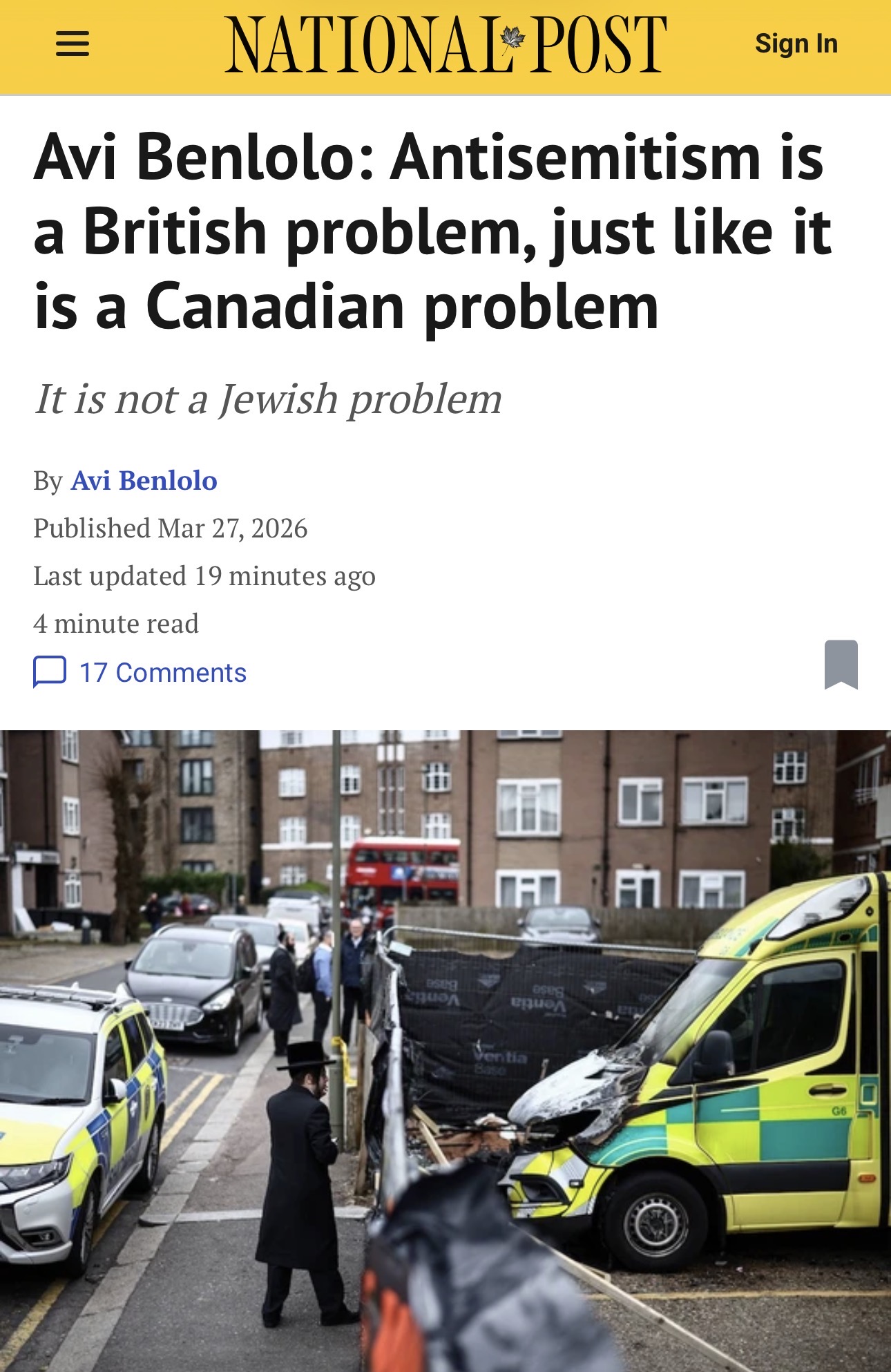 March 13, 2026: Three synagogues were shot at in the greater Toronto area in the span of a week. Canada’s leaders condemned them with words but did little. Prior to that, our children were targeted by pro-Palestinian groups for going to camp, but nothing was done. Our neighbourhoods and event gatherings were repeatedly targeted by masked pro-Hamas men and women, but everyone chose to look the other way. Ottawa earmarked $10 million to protect Jewish institutions after the gunfire attacks. But that is not enough. This is a national emergency. Ten-million dollars to protect one of this nation’s most productive and contributing communities is insulting. It’s an admission that authorities cannot protect us. If anything, to immediately protect our community from further shootings, police must be installed at every Jewish institution across the land, no matter cost. Our country is brilliant at smiling, condemning, and giving money to quiet problems. Read more HERE